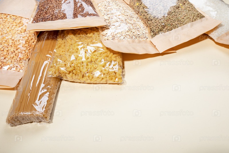 Бумажно-целлофановые пакеты с крупами, бобовыми и макаронами бежевого цвета. Карантинный запас. Скопируйте пространство