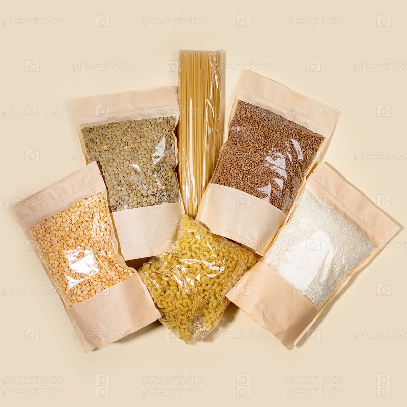 Бумажные целлофановые пакеты с крупами, бобовыми и макаронами, выложенными на бежевом фоне. Вид сверху