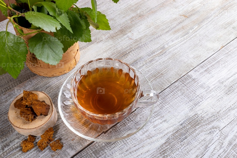 Стеклянная фигурная чашка целебного настоя березовой чаги, березовые листья, небольшой березовый пень с кусочками чаги на деревянном столе