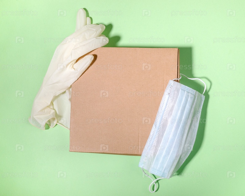 Коричневая картонная коробка, белые латексные перчатки, защитная медицинская маска на зеленом фоне. Концепция безопасной доставки. Копировать пространство