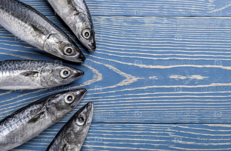 Пять рыб скумбрии выложены на окрашенном синем деревянном фоне. Обесцвеченное изображение