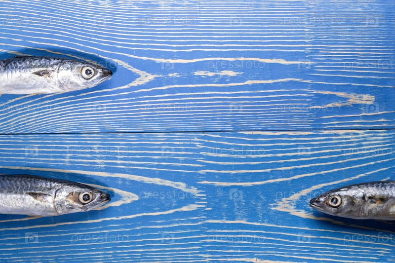 Узор из трех рыб скумбрии на окрашенном синем деревянном фоне