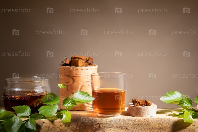 Лечебный напиток из березового гриба чага, кусочки гриба чага, веточки на деревянной доске на бежевом фоне. Скопируйте пространство