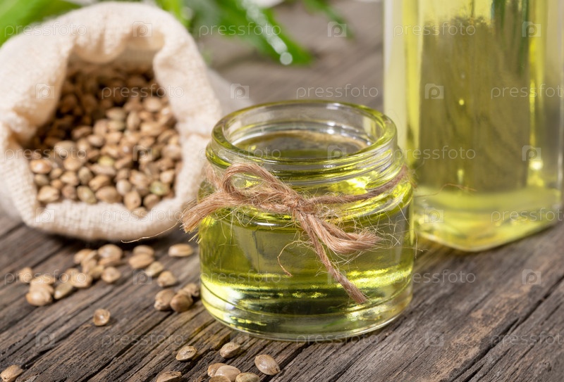 Конопляное масло крупным планом в стеклянной банке и бутылка с зернами конопли в мешке на деревянной доске