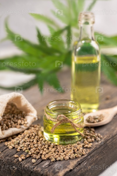 Конопляное масло в двух стеклянных банках и бутылка с зерном в мешке на деревянной доске с листьями конопли на заднем плане
