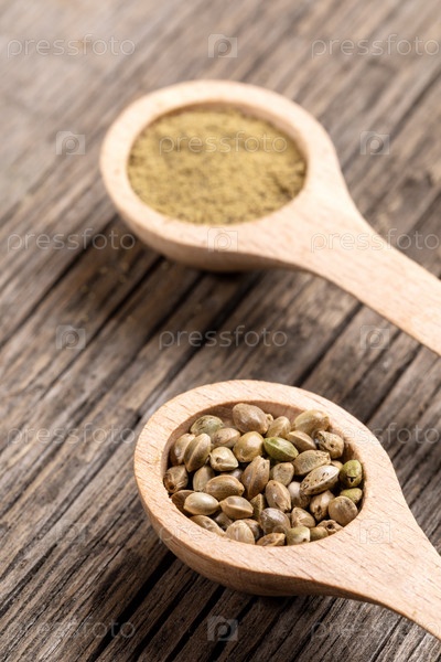 Две деревянные ложки с зернами конопли и мукой на диагональных старых деревянных досках