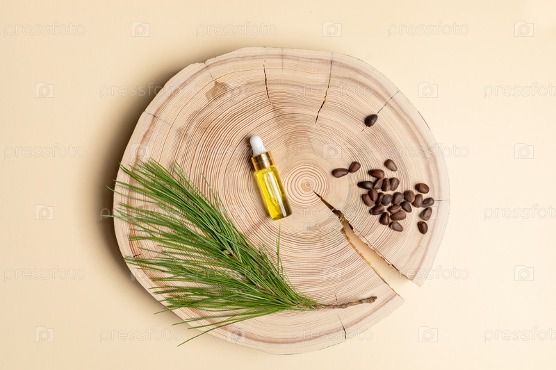 Маленькая стеклянная бутылка с хвойным спа ароматическим эфирным кедровым маслом, веткой, орехами на деревянной пиле на бежевом фоне