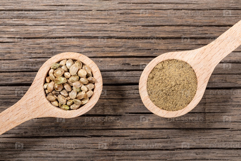 Две деревянные ложки с зернами конопли и мукой на старых треснутых деревянных досках