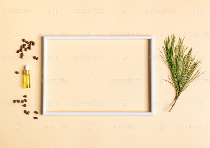 Белая пустая рамка и маленькая стеклянная бутылка с хвойным ароматическим эфирным кедровым маслом, веткой, орехами вокруг него