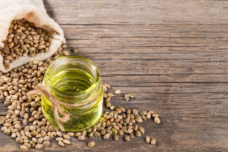 Стеклянная банка с конопляным маслом и зернами конопли, разбросанными из мешка на старых деревянных досках