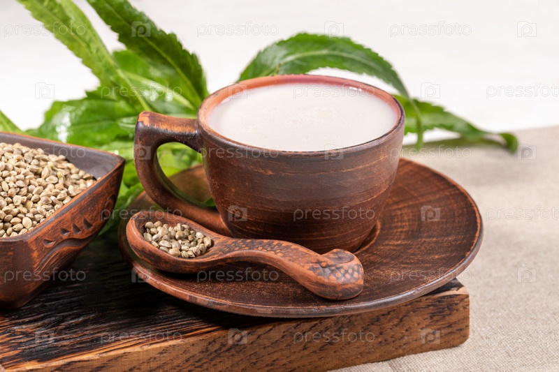Конопляное молоко в керамической чашке и зерна в коричневой керамической миске и ложке и листьях конопли