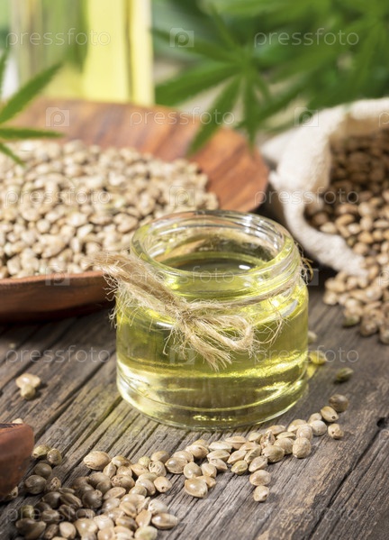 Композиция с продуктами из конопли. Масло конопли, семена и зеленые листья на старой деревянной доске