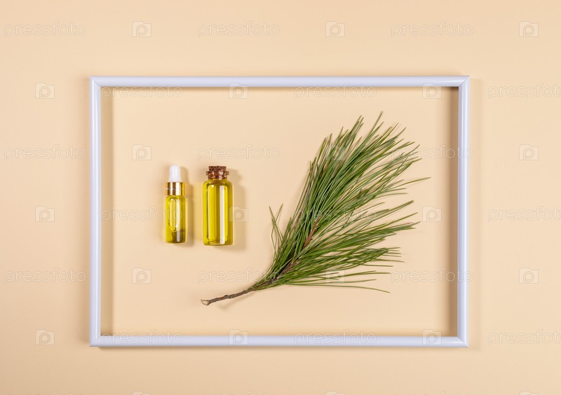 Маленькие стеклянные бутылки с ароматическим эфирным маслом хвойного кедра внутри белой рамки на бежевом фоне