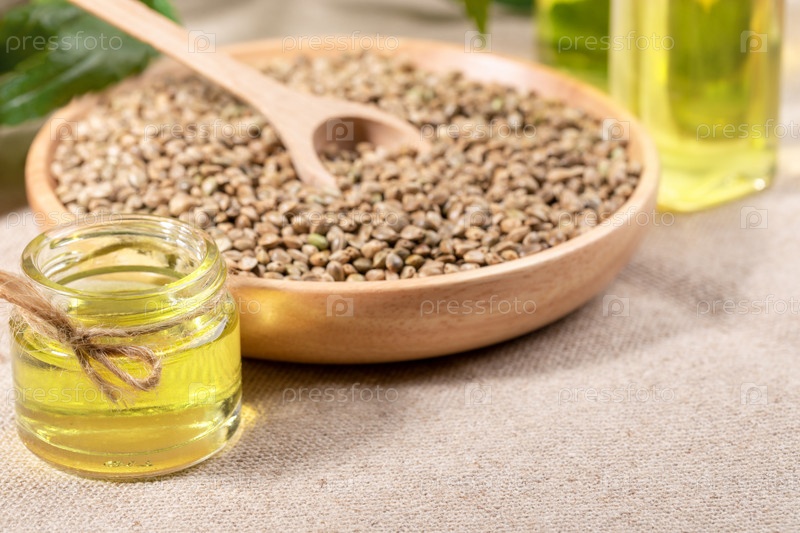 Продукты конопли крупным планом, масло в стеклянной банке и бутылке, зерна в круглой деревянной тарелке на салфетке из мешковины