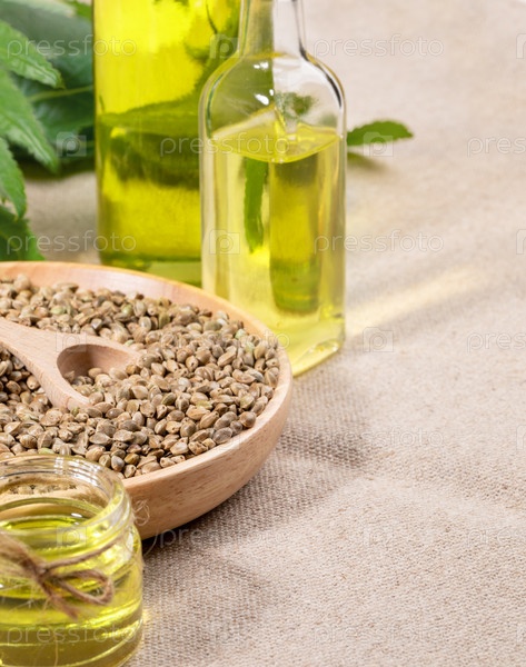 Продукты из конопли: масло в стеклянной банке и бутылке, зерна конопли в круглой деревянной тарелке на салфетке из мешковины