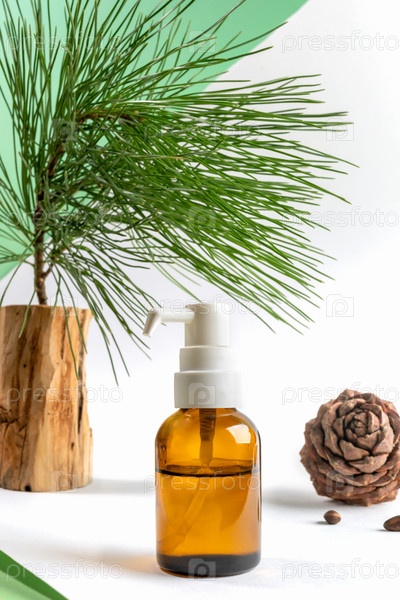 Маленькая стеклянная бутылка с дозатором эфирного кедрового масла, кедровой веткой и конусом на бело-зеленом фоне