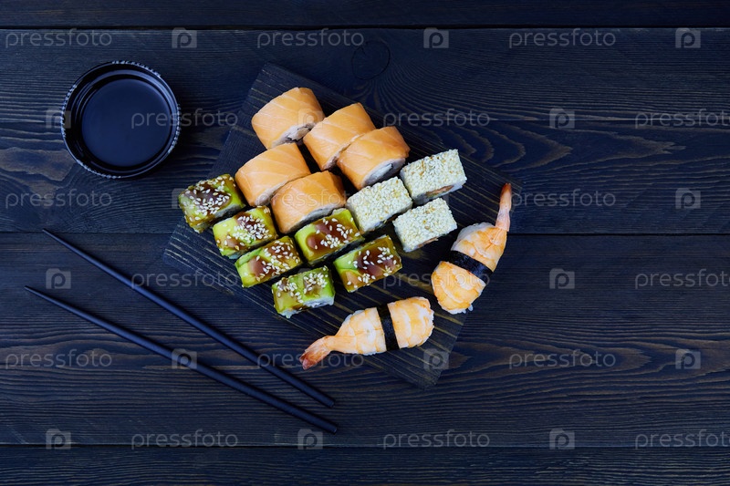 Японская еда суши. Суши-ролл Филадельфия с лососем, Суши-ролл Маки с угрем, авокадо и суши с креветкой