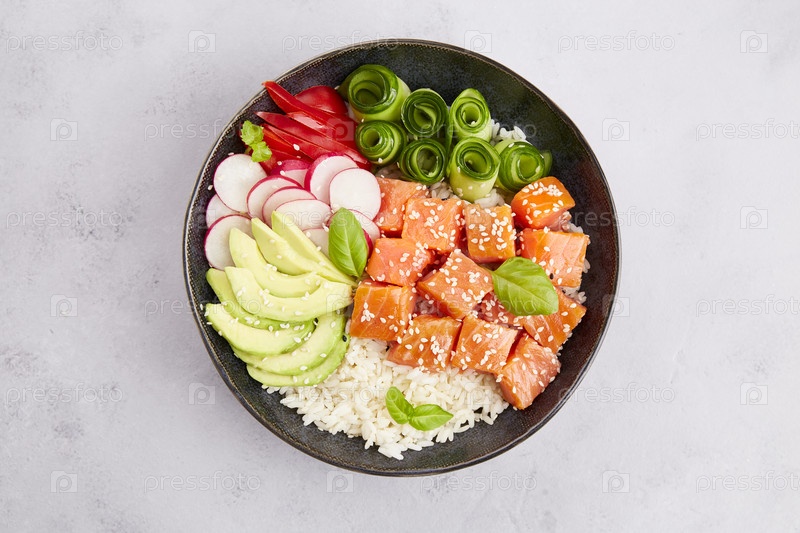 Поке боул с лососем, тунцом, рисом, авокадо, огурцом, редисом, перцем