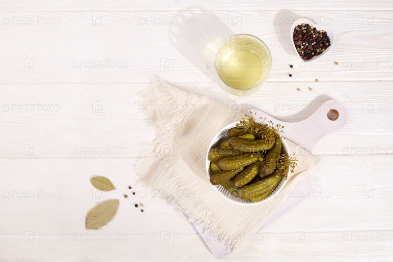 Маринованные корнишоны в миске и маринованный сок или огуречный рассол
