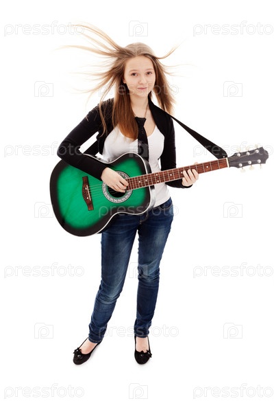 Красивая девушка с гитарой на белом фоне