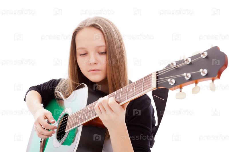 Красивая девушка с гитарой на белом фоне