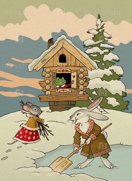 Зайцы у своей избушки убирают снег