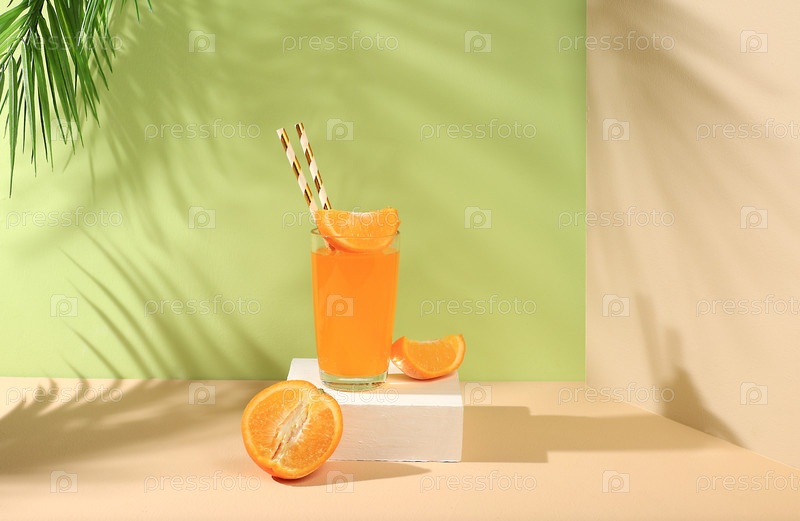 Современный натюрморт с цитрусовыми, апельсиновым соком и апельсинами на пастельном фоне с длинными жесткими тенями, концепция минимальной детокс-диеты, летние витаминные напитки, избирательный фокус, место для текста