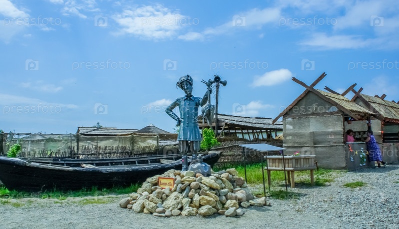 Пейзаж с металлической скульптурой и людьми в Атамани