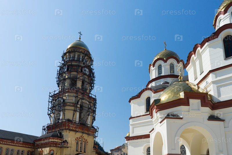 Новый Афон, Абхазия-29 июля 2014 г.: Архитектура древнего монастыря на фоне голубого неба