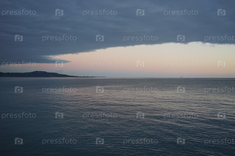 Морской пейзаж на закате с тяжелыми тучами в небе
