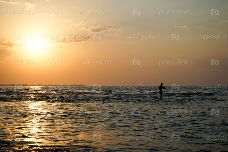 Сухуми, Абхазия-15 августа 2014 г.: Морской пейзаж с великолепным закатом и силуэтом человека, идущего по морю