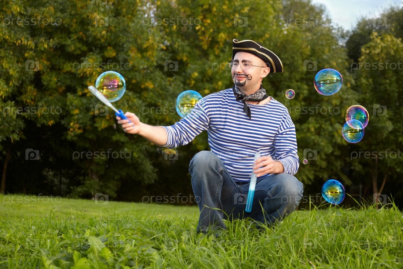 Человек в пиратском костюме надувает мыльные пузыри