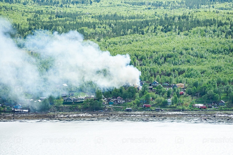 Пожар в поселке на берегу Кольского залива. Мурманск, Россия
