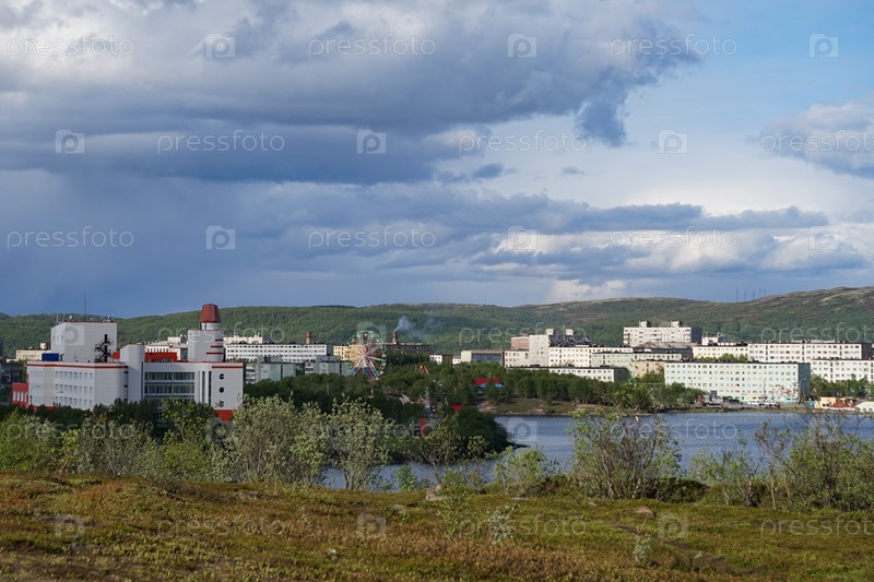 Мурманск, Россия-5 июня 2015 г.: Городской пейзаж с современными домами и деревьями под открытым небом
