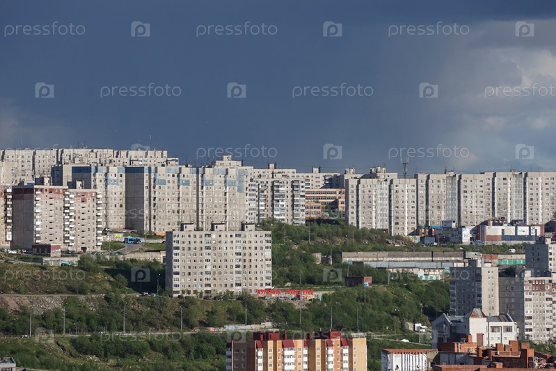 Городской пейзаж Мурманска советской архитектуры и яркая листва лета