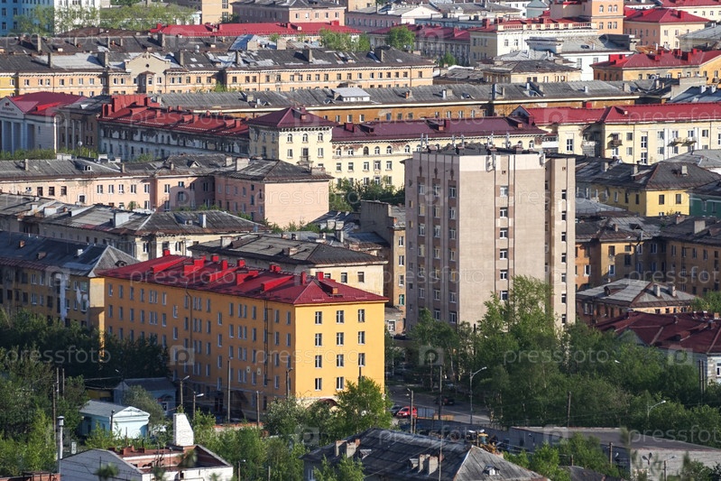 Мурманск, Россия-5 июня 2015 г.: Городской пейзаж Мурманской советской архитектуры и яркая листва лета