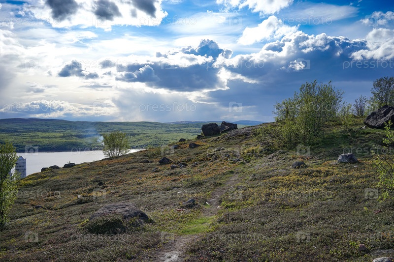Мурманск, Россия. Природный ландшафт с тундровой растительностью с видом на Кольский залив