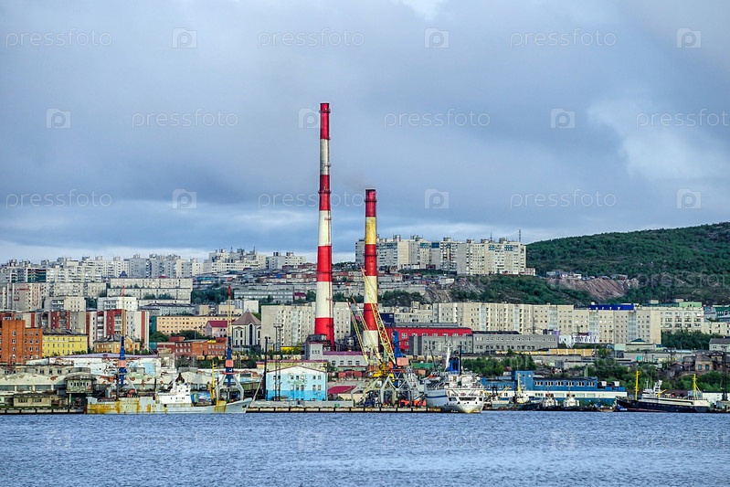 Городской пейзаж Мурманска у Кольского залива. Россия