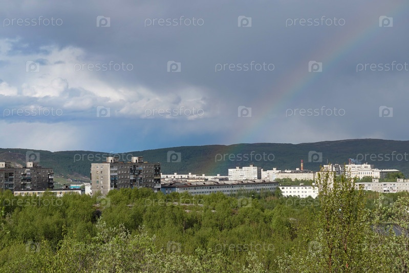 Городской пейзаж Мурманска советской архитектуры и яркая листва лета