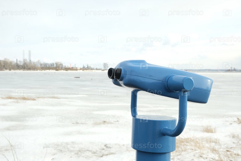 Туристический телескоп смотрит на город с видом на зимний пейзаж, бинокль крупным планом на заднем плане наблюдает за видением, концепция природы путешествия