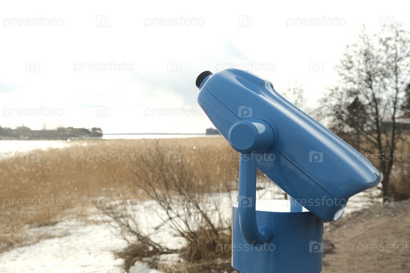 Туристический телескоп смотрит на город с видом на зимний пейзаж, бинокль крупным планом на заднем плане наблюдает за видением, концепция природы путешествия