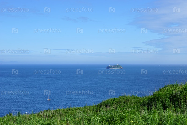 Морской пейзаж с видом на небольшой остров. Владивосток, Россия