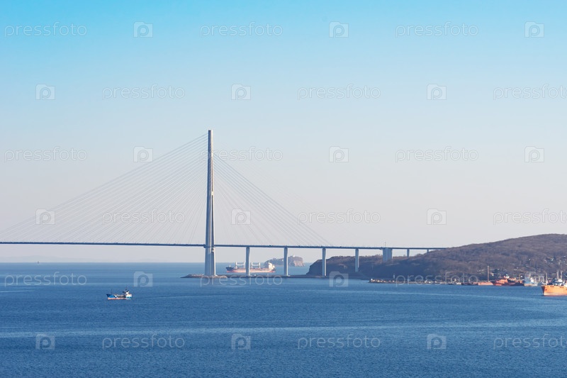 Морской пейзаж с видом на Русский мост на горизонте