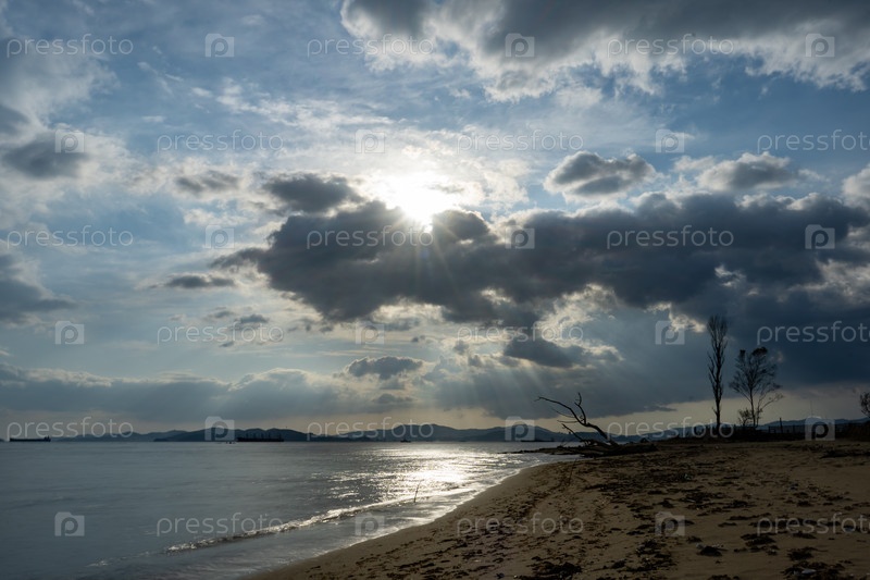 Морской пейзаж с силуэтами деревьев и кораблей в фоновом свете