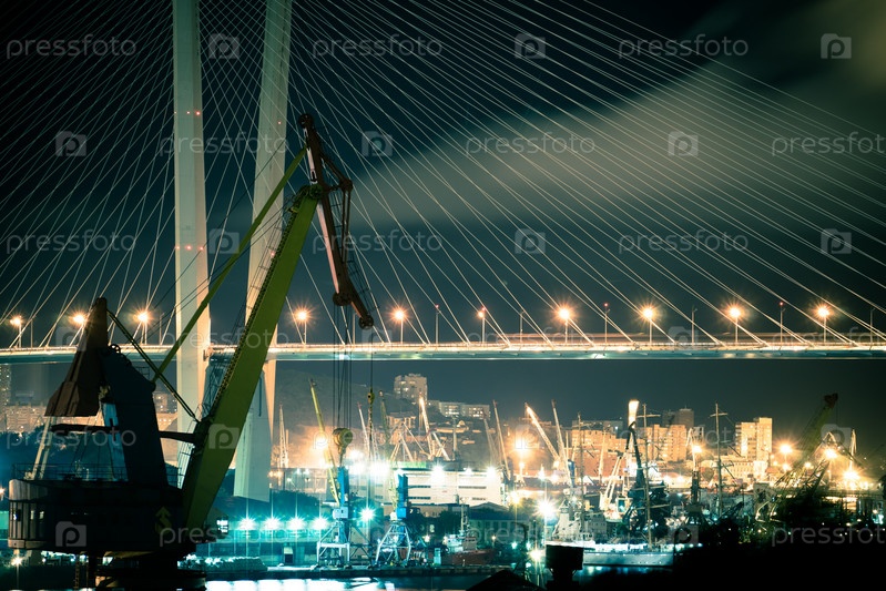 Ночной пейзаж с журавлями на фоне Золотого моста