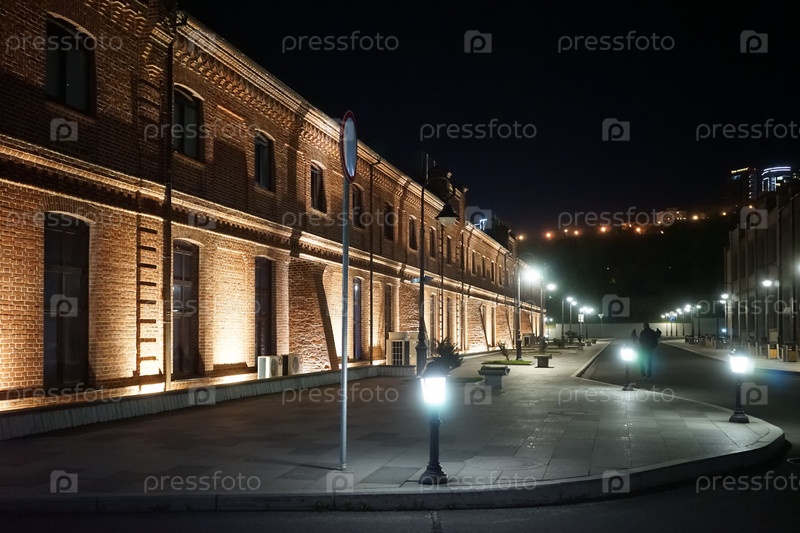 Ночной городской пейзаж с кирпичными зданиями в свете фонарей