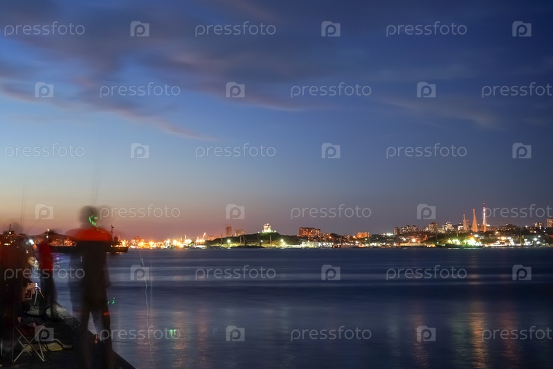 Морской пейзаж с рыбаками в синий час