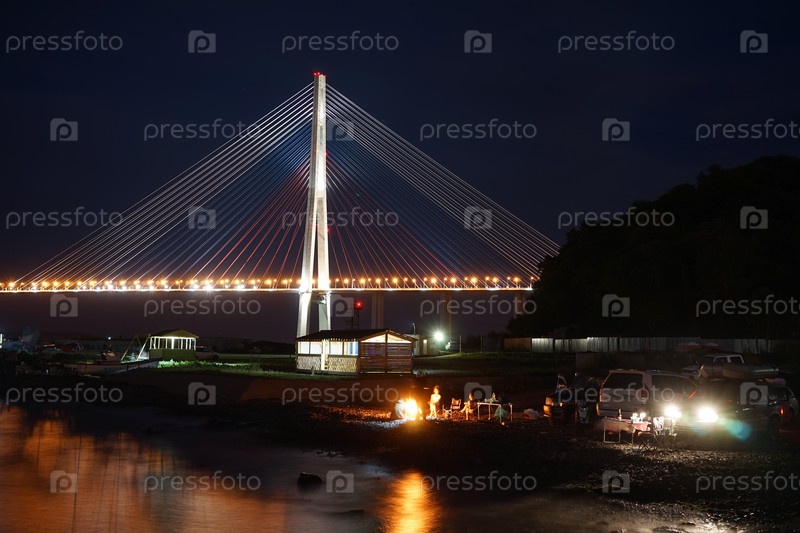 Ночной пейзаж с видом на Русский мост. Люди отдыхают на пляже. Владивосток, Россия