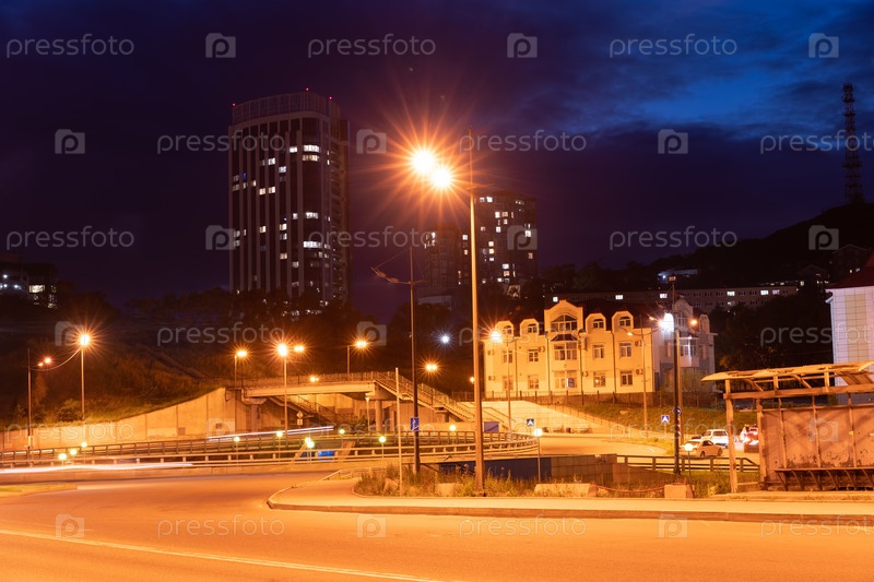 Ночной пейзаж с видом на город и автомобили