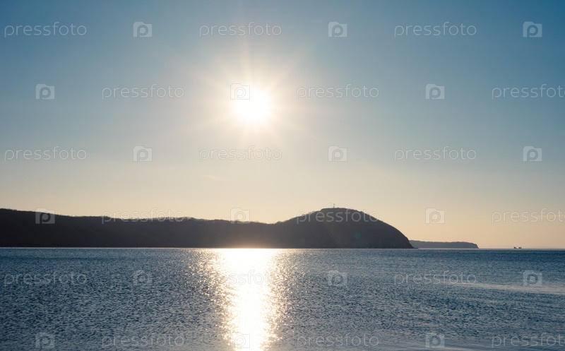 Морской пейзаж с видом на побережье и солнце